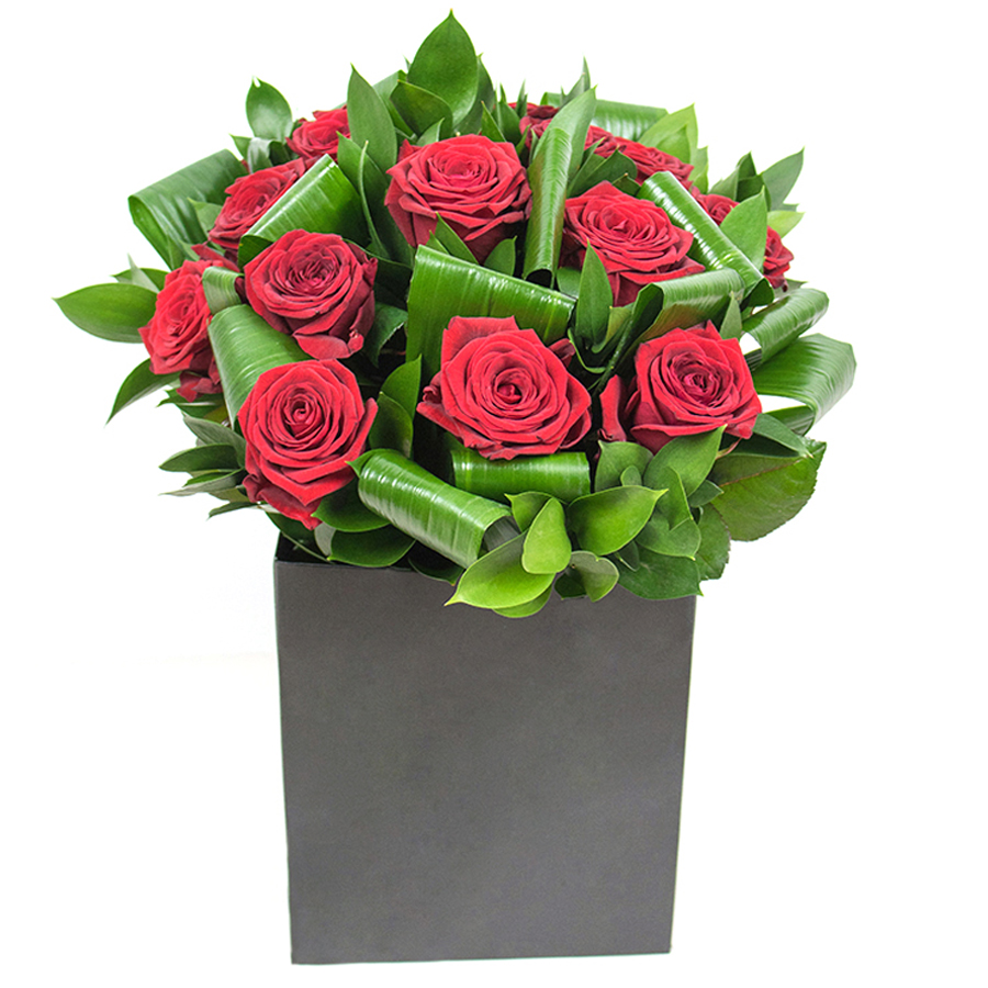 Enhance your home with our graceful bouquet featuring stunning red roses, vibrant aspidistra leaves, and lush ruscus, creating a unique and elegant floral arrangement.