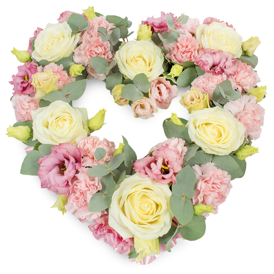 Celebrate cherished memories with our Heartfelt Elegance Flower Arrangement. This exquisite bouquet showcases a unique combination of white roses, vibrant pink carnations, graceful pink lisianthus, and aromatic eucalyptus, all expertly arranged to honor your loved one.